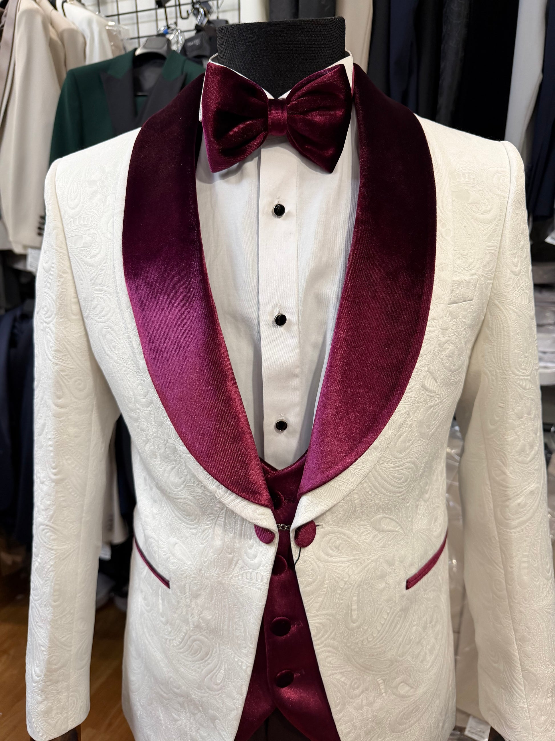 Design: Single-breasted tuxedo with velvet shawl lapel for a refined formal finish