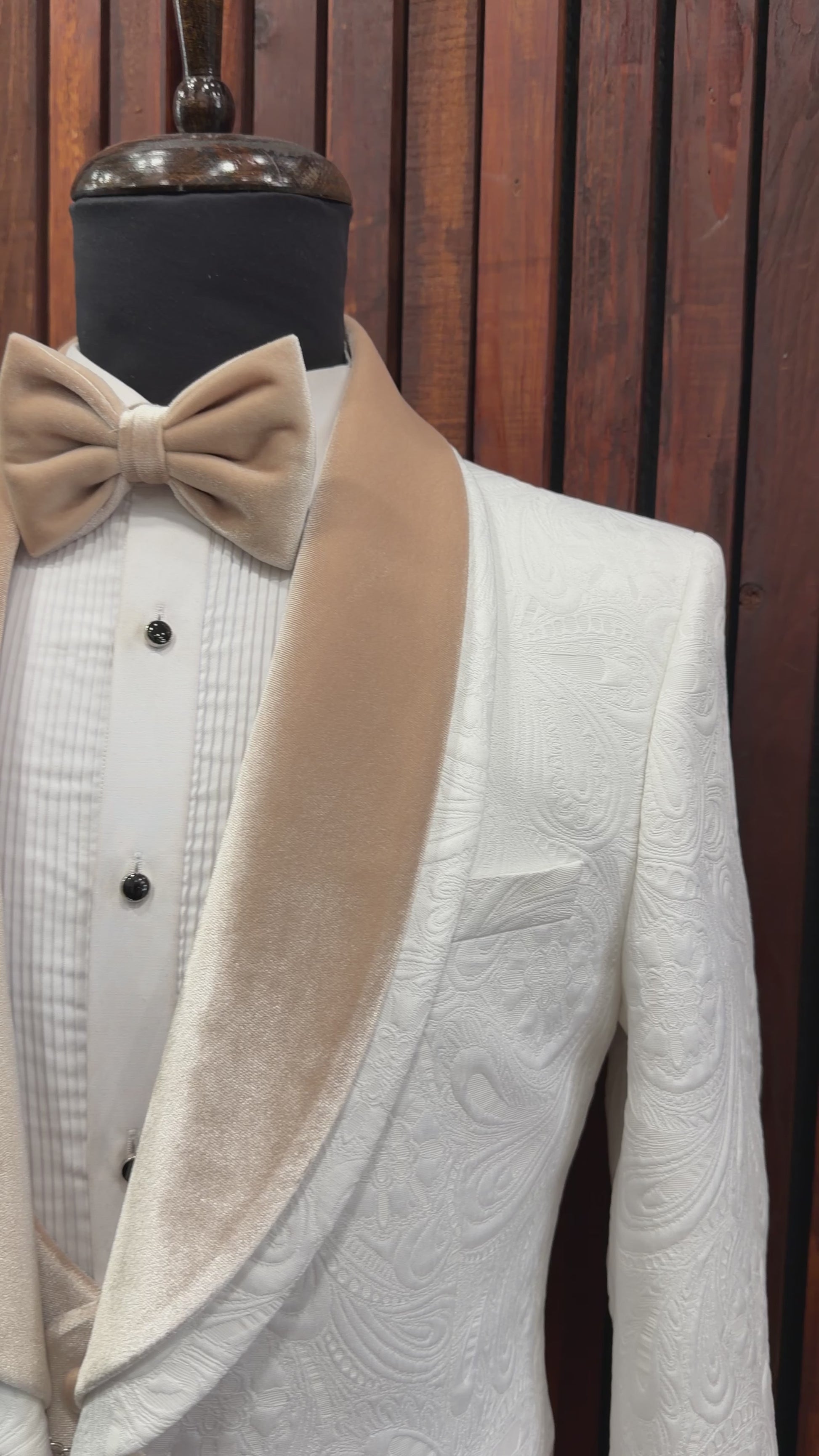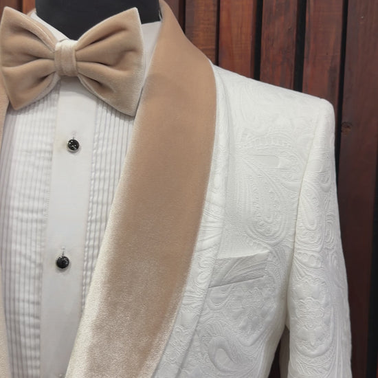 ✔ White paisley-textured blazer with champagne velvet lapel & trim